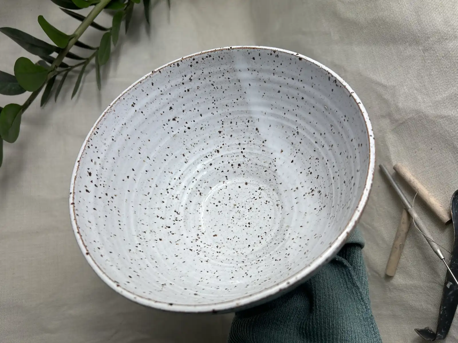 The glaze for this set is a custom-made gloss white that allows the speckles to shimmer and stand out beneath the surface.